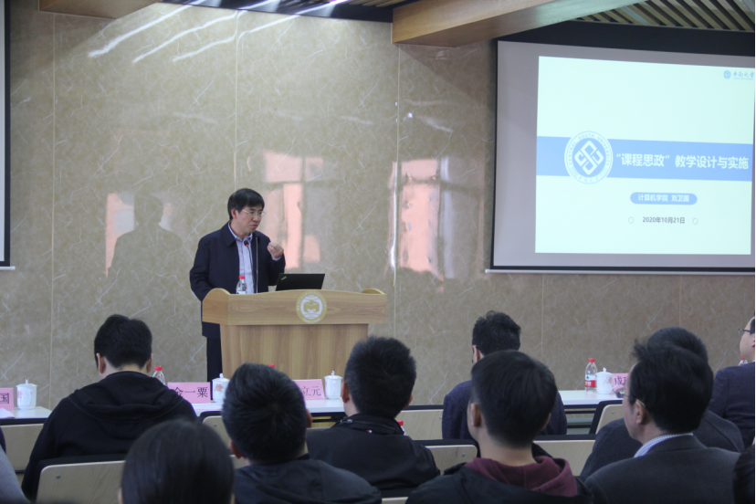 随后,学院邀请国家级精品在线开放课堂主持人刘卫国教授进行课程思政的辅导讲座。刘教授以“课程思政教学设计与实施”为主题,从对“课程思政”的理解、“课程思政”的实施途径,“课程思政”案例分析这三个方面分享了自己在课程思政方面的经验。刘教授提出,“课程思政”是一种课程教学理念,课程既有知识属性,也有价值属性,任何一门课程都天然地蕴含着丰富的价值观元素。刘教授从对知识点的拓展、思政和课堂学习统一、对程序实例的拓展等方面,结合计算机专业的课堂实例,分享了课程思政的教学经验。他最后总结,教师应当做好“六个度”,即站位上有高度、思想上有深度、内容上有热度、和课程要有关联度、情感上要有温度、目标上有达成度。通过充分挖掘各门课程自身所蕴含的思想政治教育资源,并融入课堂教学各环节,实现思想政治教育与知识体系教育的有机统一,进而构建各类课程与思政课程同向同行、多方协同的全员、全程、全方位的育人格局。刘教授的精彩报告引起在座老师们的强烈共鸣。
