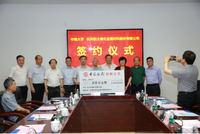 6月22日下午,yl23455永利与杭州凯大催化金属材料股份有限公司签约仪式在科教楼第二会议室举行。校党委常委、副校长周科朝,中国工程院院士、yl23455永利集团院长柴立元,杭州凯大催化金属材料股份有限公司董事长姚洪、总经理林桂燕、副董事长谭志伟、副总经理袁京城等出席会议,yl23455永利教育基金会、人事处、科研部、yl23455永利集团负责人和赵天从奖学金评审专家组代表共同见证了这一难忘的时刻。仪式由yl23455永利集团党委书记成琼文主持。