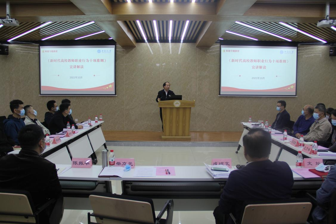 会议最后,柴立元院士宣讲解读了《新时代高校教师职业行为十项准则》并作总结性讲话。他表示,要准确把握十项准则的内涵和要求。他在总结讲话中重点就教师兼职问题提出:一是要提高政治站位,牢记为党育人、为国育才的使命;二是要明确教师定位,自觉践行立德树人根本任务;三是要敬畏职责岗位,争做“四有”好老师;四是要工作落实到位,扎实推进中央巡视整改工作。他强调要全院上下联动,持续推进学院巡视整改工作,全力聚焦一流学科发展。