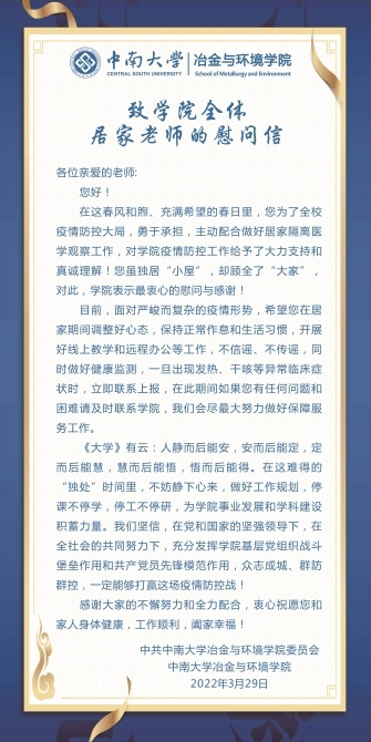 学院全天候在教职工信息群开展疫情排查和防疫信息发布,建立疫情防控工作台账,汇总疫情信息并发布学院疫情防控提醒。学院全力配合学校全员核酸检测的统一部署,迅速行动,通知到位,实现全体教职工核酸检测应检尽检。对健康码变色的教师进行政策介绍和心理安抚,学院发布《冶环院致学院全体居家老师的慰问信》,精准帮助有实际困难的教职工。