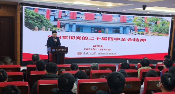 会议伊始,成琼文围绕党的二十届四中全会精神作专题宣讲。他重点解读了党的二十届四中全会的重大意义和“十五五”规划建议主要内容,指出党的二十届四中全会对我国未来五年发展作出顶层设计和战略擘画,也为学院发展指明了前进方向、提供了根本遵循。结合学院发展形势与挑战,成琼文强调,全体师生党员要进一步增强紧迫感、责任感,抢抓机遇、凝心聚力、担当作为,以一流党建引领学院内涵式高质量发展。