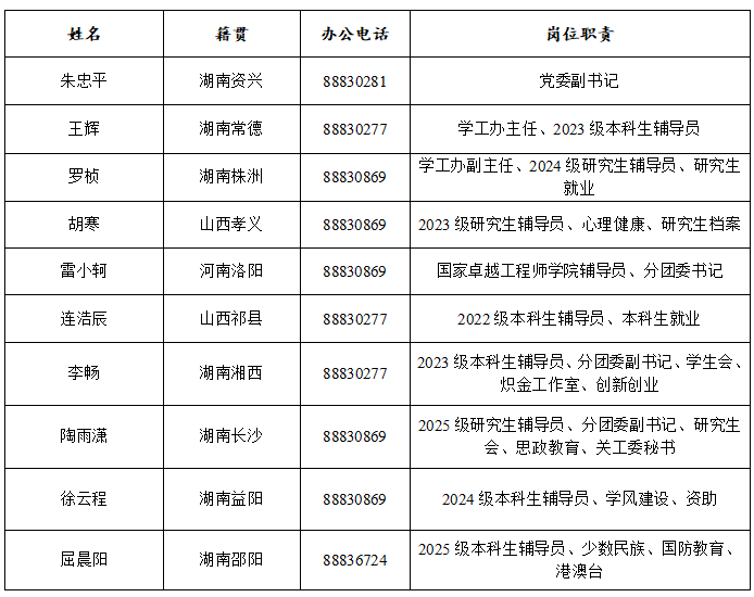 学院拥有专业化、职业化的学生工作队伍,多人次获得“全国高等学校创业教育先进个人”、“湖南省高校思想政治教育研究先进个人”、“湖南省研究生思想政治教育研究与实践先进个人”、“湖南省高校辅导员工作研究与实践百佳个人”等称号。